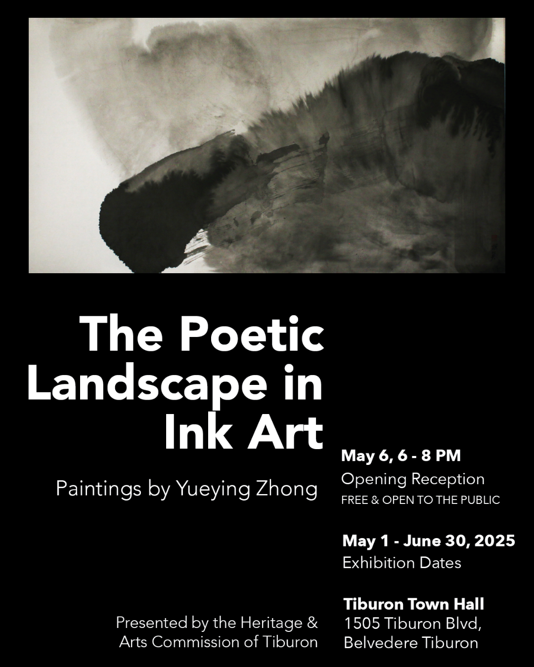 Featuring: The Poetic Landscape in Ink Art; Paintings by Yueying Zhong Artist Reception: May 6 ~ 6 to 8 PM ~ Free & Open to the public Tiburon Town Hall, 1505 Tiburon Boulevard, Second Floor