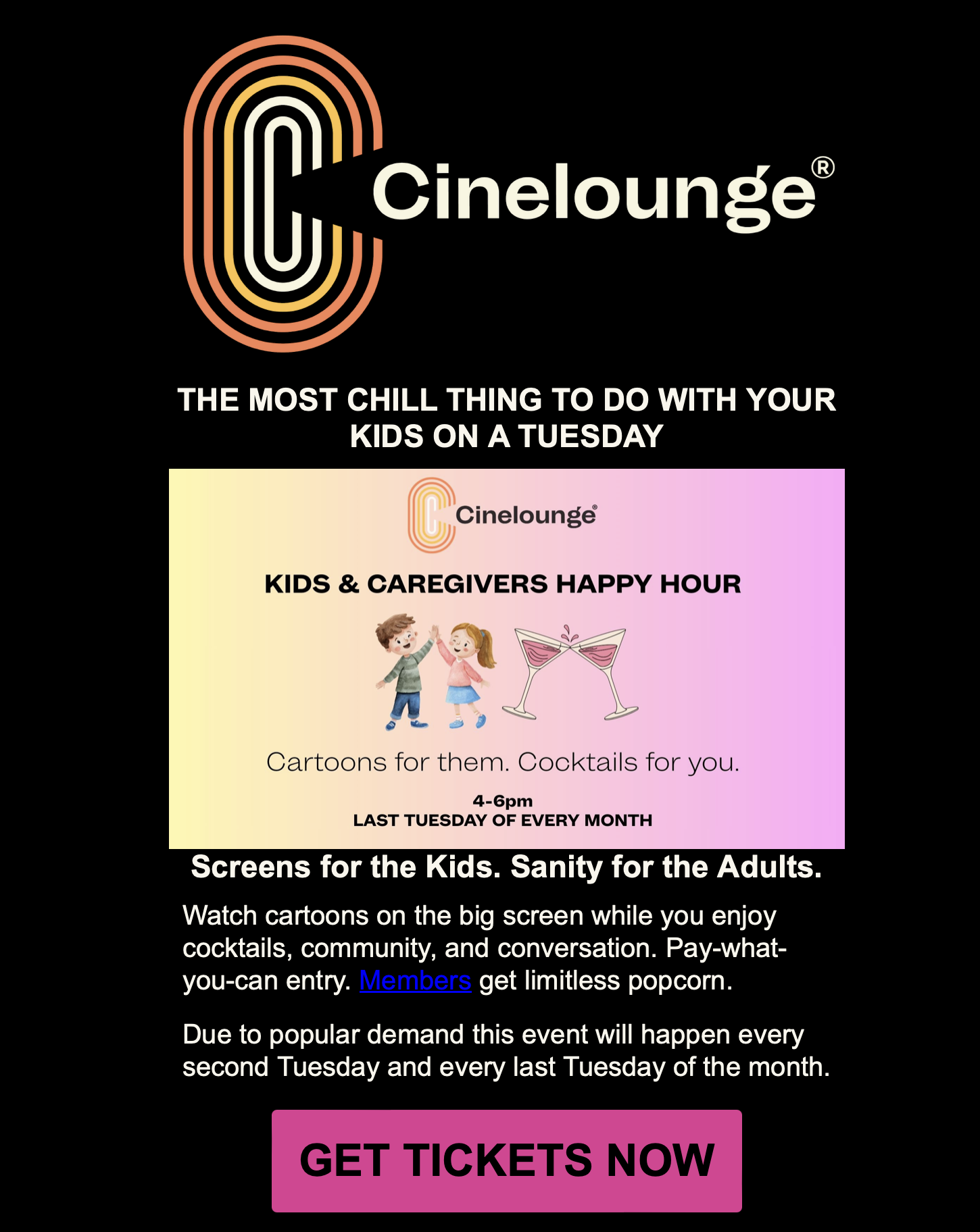 Also, did you know the busy business owners of Cinelounge are also full-time working parents with a Four Year Old BadA$$ who also thinks she is a business owner?! They know what it means to be run ragged as working parents. And even “non-working” parents (says this exhausted SAHM currently typing). So if you see a typo or a missed date…just know we are all working on our sanity and appreciate your support. Hence a judgement free time and space to catch our breath and catch up with friends. Bluey will play on the big screen; bar open. Kids are entertained; adults can take a break. It’s really the definition of happy hour… with an extra hour for good measure. Responsible adulting is required. Thanks for joining!